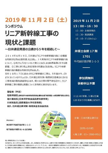 日本弁護士連合会主催で、リニア新幹線のシンポジウムが開かれます。日弁連が2014年、リニアに対し「慎重な再検討を求める意見書」を公表、それから5年を経ての検討シンポジウムです。先着120名まで。