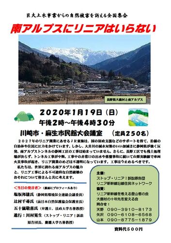 巨大土木事業からの自然被害を訴える全国集会「南アルプスにリニアはいらない」、明日19日(日)、午後2時、会場は小田急新百合ヶ丘駅のそばです。貴重なお話しが聞けると思います。どうぞご参加ください。