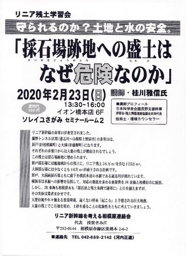 相模原市緑区のリニア「津久井トンネル」10.5キロメートル、非常口2か所は、採石場のそばに位置変更された。トンネルからでる残土は、その採石場跡地に埋められる。すぐ近くの道志川から横浜市は取水している。守られるのか、土地の安全と水の安全。