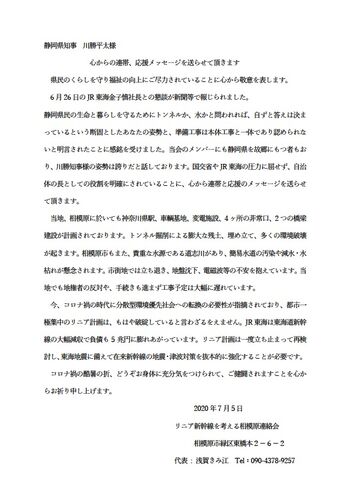 県民の命やくらしを守るため頑張っていらっしゃる川勝知事に、リニア新幹線を考える相模原連絡会から、心からの連帯と応援のメッセージを送りました。