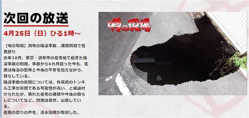 明日25日(日)午後1時、BS-TBS 「噂の東京マガジン」、【噂の現場】で3回目となる外環道陥没問題をとりあげます。衛星放送に移行してから最初の放送です。ぜひ見てみませんか。 https://bs.tbs.co.jp/uwasa/