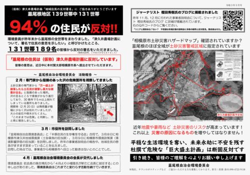 相模原市緑区長竹、志田峠近くに計画されている津久井農場計画、沢が流れる斜面に60万㎥の盛土をし、そのてっぺんに農場をつくる計画だ。地元韮尾根(にろうね)自治会の環境委員会が「署名で住民の意思を示したい」と全世帯をまわり署名を集めたところ、94…