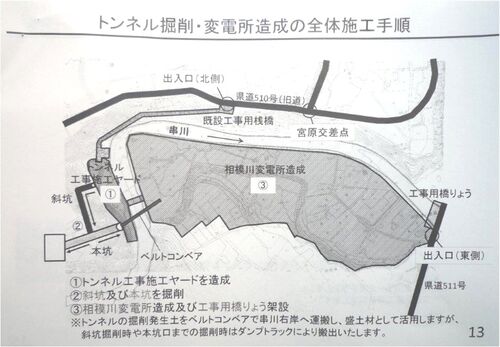 6/25、6/26、変電所予定地の小倉で工事説明会が開かれた。参加者は両日とも20人くらい。開催時間は1日目は90分、2日目は2時間弱だった。トンネル掘削の工事ヤードから工事を始め、掘削が始まれば残土を変電所の盛土に使う。工事車両の通行は主に、圏央道で使…