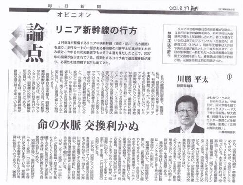 静岡県の川勝知事の考えを直接知ることができます。知事選の様子もわかり面白い。他にお二人の意見が載っています。新聞コピーの下にweb版でもご紹介します。 命の水脈、交換利かぬ 川勝平太・静岡県知事 6月の静岡県知事選で、現職の私は、自民党推薦の候補…