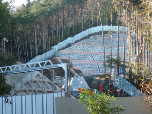 長竹非常口からの残土トラックが増えているように感じています。久しぶりにヤード側面から写真を撮ってみました。 ゲートからの写真、この位置から斜坑のトンネルはみえません↓ 写真右、中ほどに斜坑トンネルとつながっている換気ダクトのようなものが見える↓