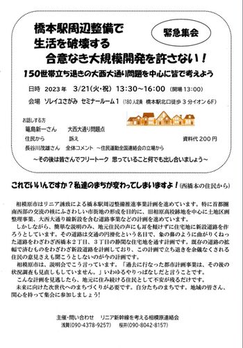 150世帯立ち退きの大西大通り線問題を中心に、皆さんと一緒に考えたいと思い計画しました。どうぞご参加ください。