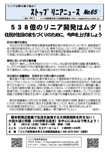 ★ストップリニアニュースNo.65 (2023.3.1発行) ◎538億のリニア開発はムダ! ◎相模原も難問抱えリニア完成のメド立たず ◎大深度トンネル、北品川"調査掘進"は僅か50mでストップ