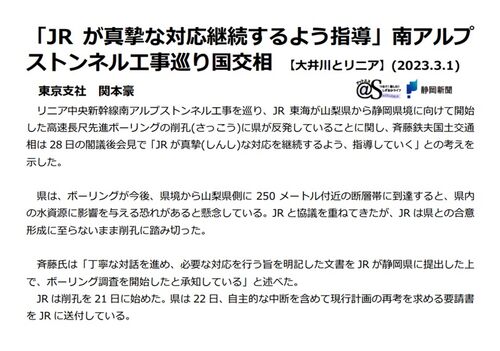 静岡県の川勝知事が、2月28日の定例記者会見で、JR東海が山梨県内から静岡県堺に向けた高速長尺先進ボーリングを開始したことについて懸念をしめしていたが、その後もボーリングは進められておりJRのホームページでデータが公開されている。 中央新幹線南ア…