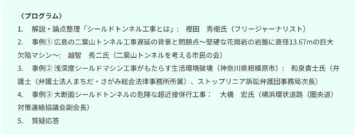 オンラインセミナー: 未来の交通インフラが環境破壊!?〈シリーズ第3弾〉~住民生活を脅かす広島高速5号線・リニア・横浜環状道路のシールドトンネル工事 | 国際環境NGO FoE Japan 【日時】2023 年10月25 日(水)19:00~21:30 【参加費】無料【申し込み…