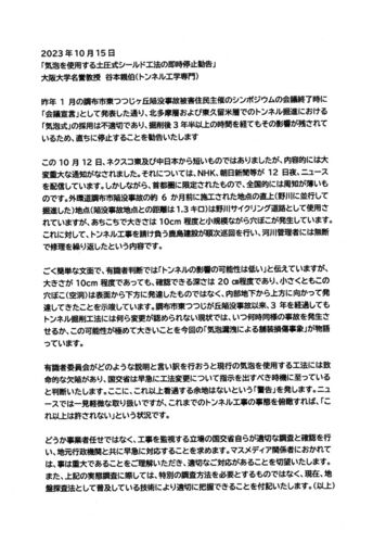トンネル工学専門の大阪大学名誉教授、谷本親伯氏が警告を発しています! ・・・有識者委員会がどのような説明と言い訳を行おうと現行の気泡を使用する工法には致命的な欠陥があり、国交省は早急に工法変更について指示を出すべき時期に至っていると判断いた…