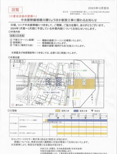 自治会に回覧された、来年1月~3月の工事のお知らせです。 相模川の中で行われる下部工(ケーソン基礎)は、昼夜工事になります。