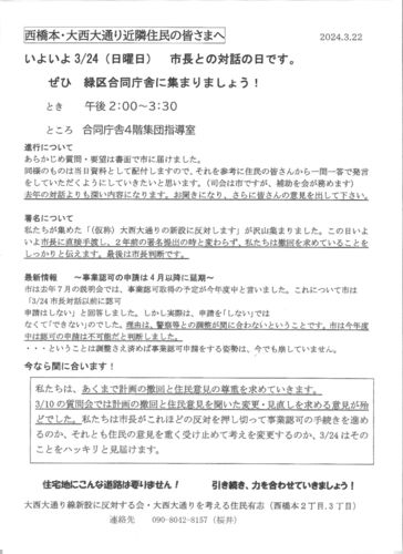 昨年8月に続いて相模原市長と直接対話する機会を設けることができました。住民のみなさんの粘り強い交渉の結果です。時間は1時間半。100世帯に立ち退きを強いる新設道路計画、簡単に認められません。近隣のみなさんも、誘い合ってご参加ください。