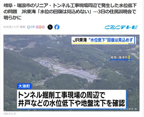岐阜・瑞浪市のリニア・トンネル工事現場周辺で発生した水位低下の問題 JR東海「水位の回復は見込めない」…3日の住民説明会で明らかに(CBCテレビ) - Yahoo!ニュース