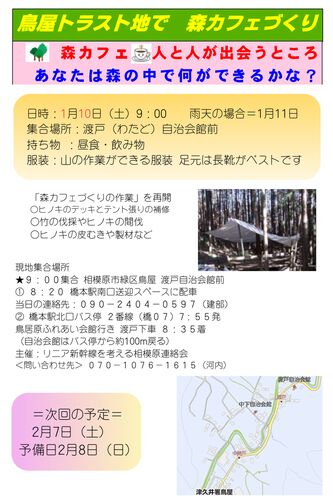 今年初めての森カフェ、午前中は寒く、お昼過ぎに日が差し込みようやく暖かくなりました。テントの支柱(はり)が折れた部分があり、次回1月10日(土)補修する予定です。はりにする木の皮むきもやります。 お昼前に豚汁をたくさんつくってもらい、温まりま…