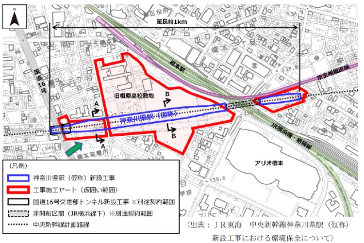 2020-06-01 5月のリニア駅<旧橋本こどもセンター~国道16号>(相模原市・JR橋本駅付近) リニア神奈川県駅、国道16号に近い部分(名古屋寄り)の工事の様子。相原高校に隣接の旧橋本こどもセンターから、国道16号手前まで。東京電力・橋本変電所に面した緑の矢印のあたりです。(地図は相模原市のホームページから) 旧橋本こどもセンターを奥に見て 旧橋本こどもセンターの前、 まだ用地取得は終わっていないように見える 橋本こどもセンター前信号のそばにできた車両出入口(西ゲート)
