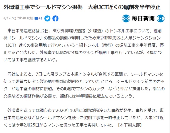 2022-04-14 東京外環道でシールドマシン損傷 大泉JCT近くの掘削を半年停止(4/12毎日新聞web) 外環道工事でシールドマシン損傷 大泉JCT近くの掘削を半年停止(毎日新聞) - Yahoo!ニュース