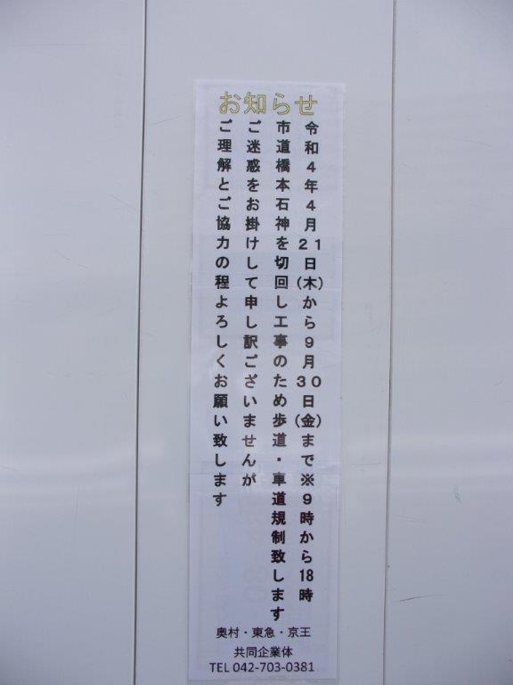 2022-08-10 7月中旬の・リニア神奈川県駅中心部の工事ヤード リニア駅予定地・中心部の工事ヤードで、掘削箇所の上に橋を架ける作業が続いています。また横浜線側の市道橋本石神で切り回し工事のため、歩道と車道の規制が行われています(9月末まで)。 右手に西側の工事ヤードが見えて↓ 歩道と市道を規制中↓ 東ゲート(車両出口)に近い側↓ 歩行者規制入口付近↓ アリオに近い側、車道規制↓