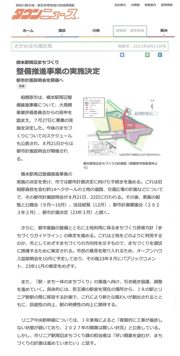 2022-08-15 橋本駅周辺まちづくり 整備推進事業の実施決定 都市計画説明会開催へ タウンニュース2022.8.11 相模原市による8月21日(日)、8月22日(月)都市計画説明会など都市計画決定へ向けてのスケジュールの他、「まちづくりガイドライン」の策定についても書かれている。