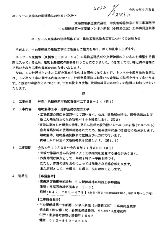 橋本駅から徒歩15分の4階建て賃貸マンションが、基礎杭がリニアのトンネルにかかると解体・撤去されることがわかりました。工事期間は今年10月から来年11月まで、工事はリニア町田市内・小野路工区の㈱安藤・間(はざま)JVが担当。