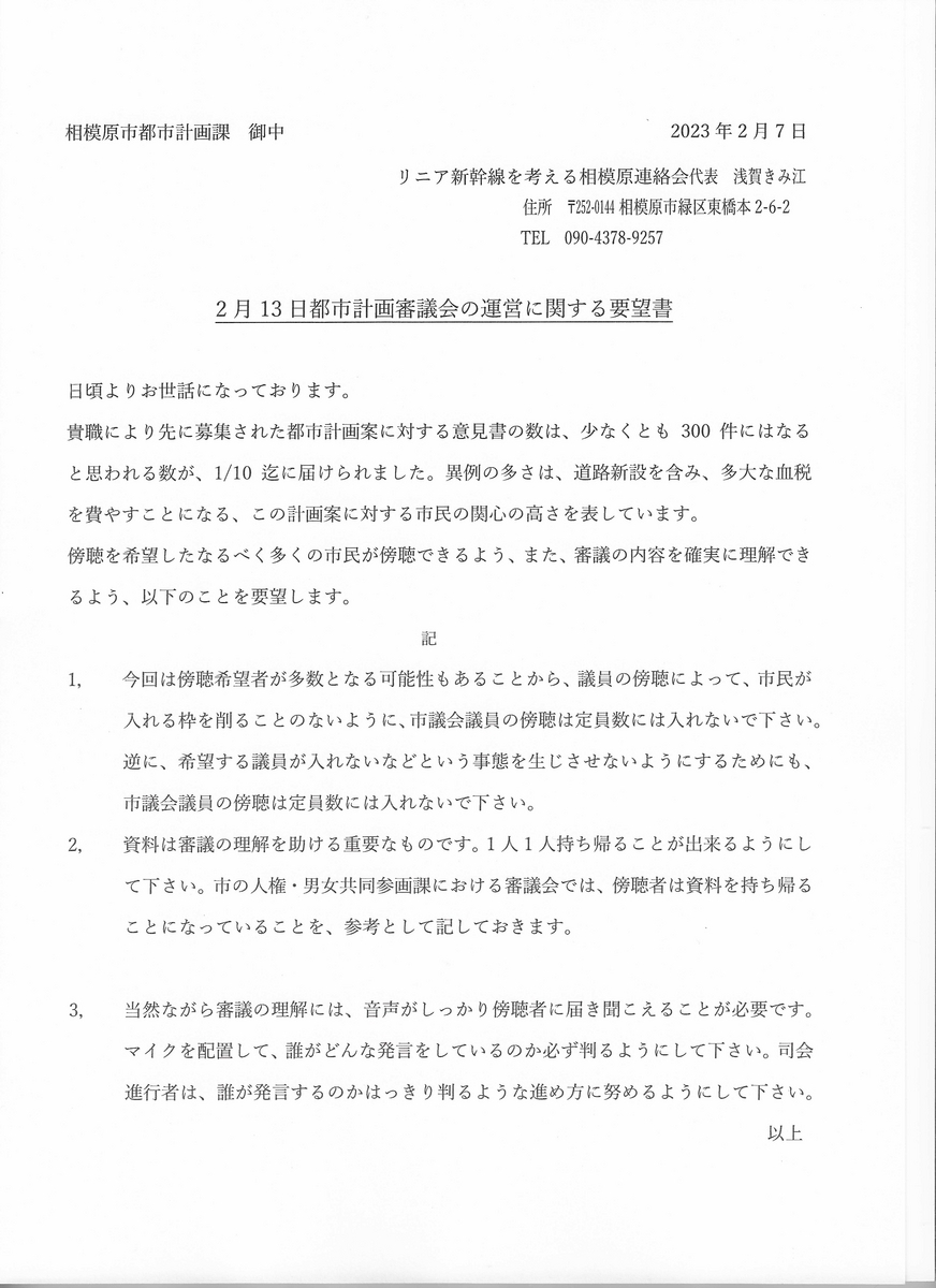 2023-02-10 2月13日 <都市計画審議会の運営に関する要望書>提出(相模原) リニア新幹線を考える相模原連絡会が、相模原市に2月13日開催の<都市計画審議会の運営に関する要望書>を提出しました。