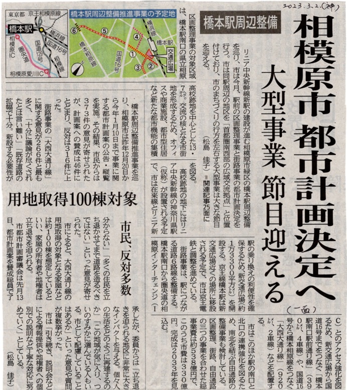 2023-03-04 相模原市 都市計画決定へ 橋本駅周辺整備 大型事業 節目迎える <2023.3.2 神奈川新聞> 神奈川新聞が橋本駅周辺整備について一面で取り上げ、今月相模原市が都市計画決定を行うことを報じた。都市計画案・意見書について、大西大通り線に関する意見が266件と最も多く、意見は反対多数だったことなども伝えている。同日付25面でも道路新設で移転を迫られる住民の声も報道した。