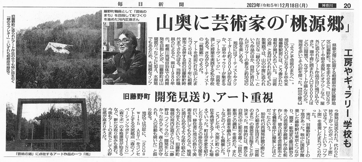 2023-12-21 山奥に芸術家の「桃源郷」、旧藤野町 開発見送り、アート重視(相模原)<毎日新聞2023.12.18> リニア相模原連絡会のメンバーで、鳥屋「森カフェ」の世話役、河内正道さんが毎日新聞で紹介されました。ほかにも石砂山(いしざれやま)のギフチョウのパトロール、子どもたちと農業、などなどみなさんに頼られています。