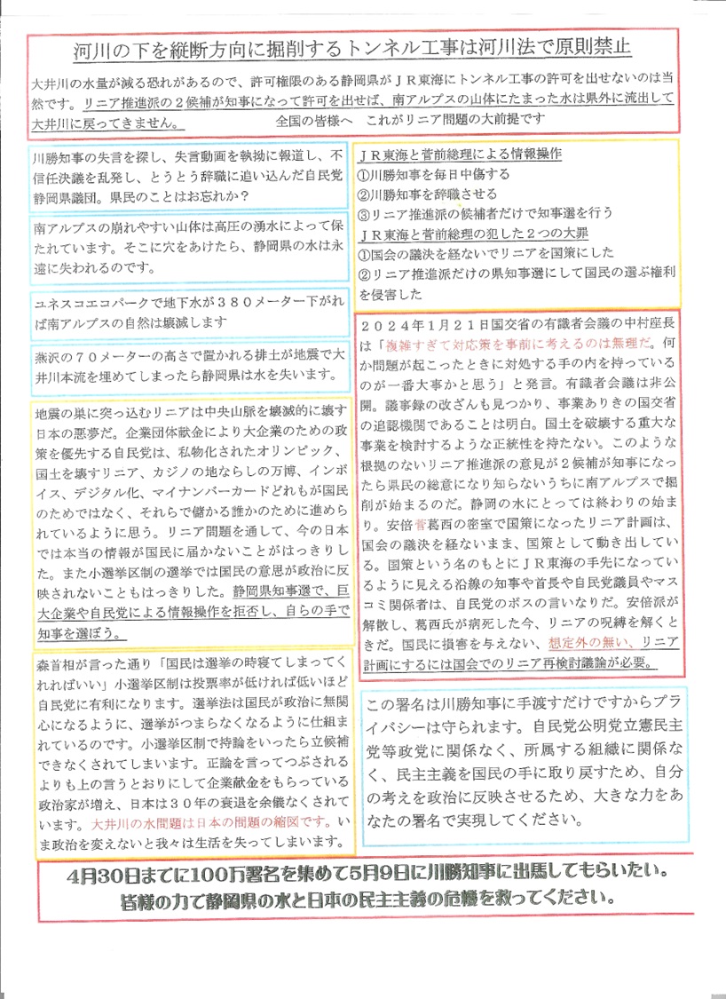 2024-04-29 リニアより命の水を 川勝平太氏に再出馬を要請する署名(5月9日告示、26日投開票) 環境政策の継続を求め、川勝氏に再出馬を要請する署名を、静岡の方たちを中心にが取り組んでいます。4月30日までにと署名を集めています。みなさんも応援しませんか。 ネット署名は・・:カラーページ(川勝知事の写真がある)左上のORコードから