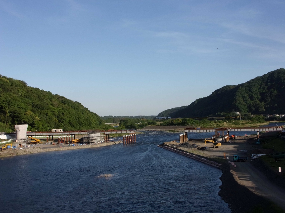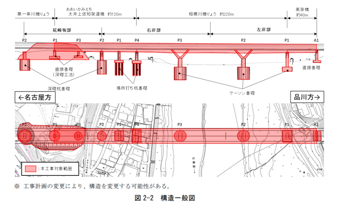 2024-05-21 リニア相模川橋りょう工事、5月中旬の様子(相模原) 相模川橋りょう工事は夜中まで工事が行われ、騒音、振動で苦しむむ住民がでている。住宅地のすぐそばで工事が行われている。 小倉橋から5/11撮影、6月から川の中の工事は休止予定(水量が増える時期、川の中に障害物は置けない)↓ 左が品川方向、橋脚(p1)ができ、隣りの橋脚(p2)も形が見えて↓(下記の図参照) 相模川左岸、品川から出発したリニアが初めて顔を出すところ。左手すぐ隣に住宅がある。↓ 相模川右岸・川の中のヤード、さらに右手地上にもヤードがあり、隣接して複数の住宅がある↓ JR東海・相模川橋りょう・環境保全より↓