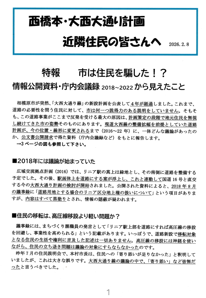 2026-02-11 2026. 2/12(木)18:00~ 西橋本・大西大通り計画、相模原市当局職員との質問&討論会 2/12(木)18:00~ 会場:相模原市緑区合同庁舎 4階 集団指導室で 市から・リニアまちづくり課 ・リニア拠点整備事務所が参加します。